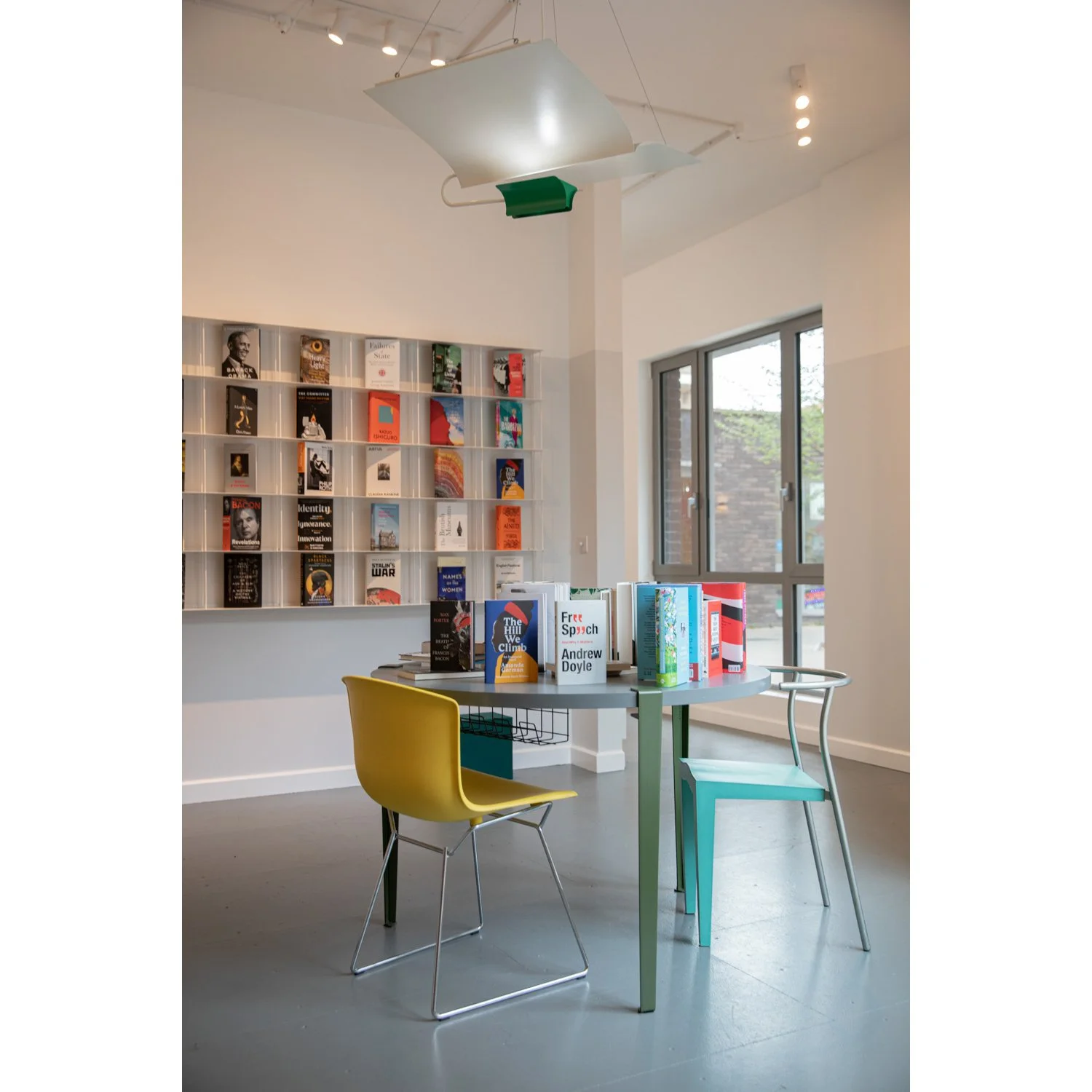 On entering, visitors have an immediate view of the primary display wall, with glimpsed views towards the triangular bookshop beyond. We sought to maintain a connection to the street, rather than make the gallery a concealed, windowless box. A combination of overhangs and the gallery’s orientation prevent sunlight reaching the art work, yet the large windows allow plenty of diffuse daylight to enter the space. Track lights above, and their exposed circuits, create a subtle additional textural layer and allow for light levels and direction to be tweaked freely.