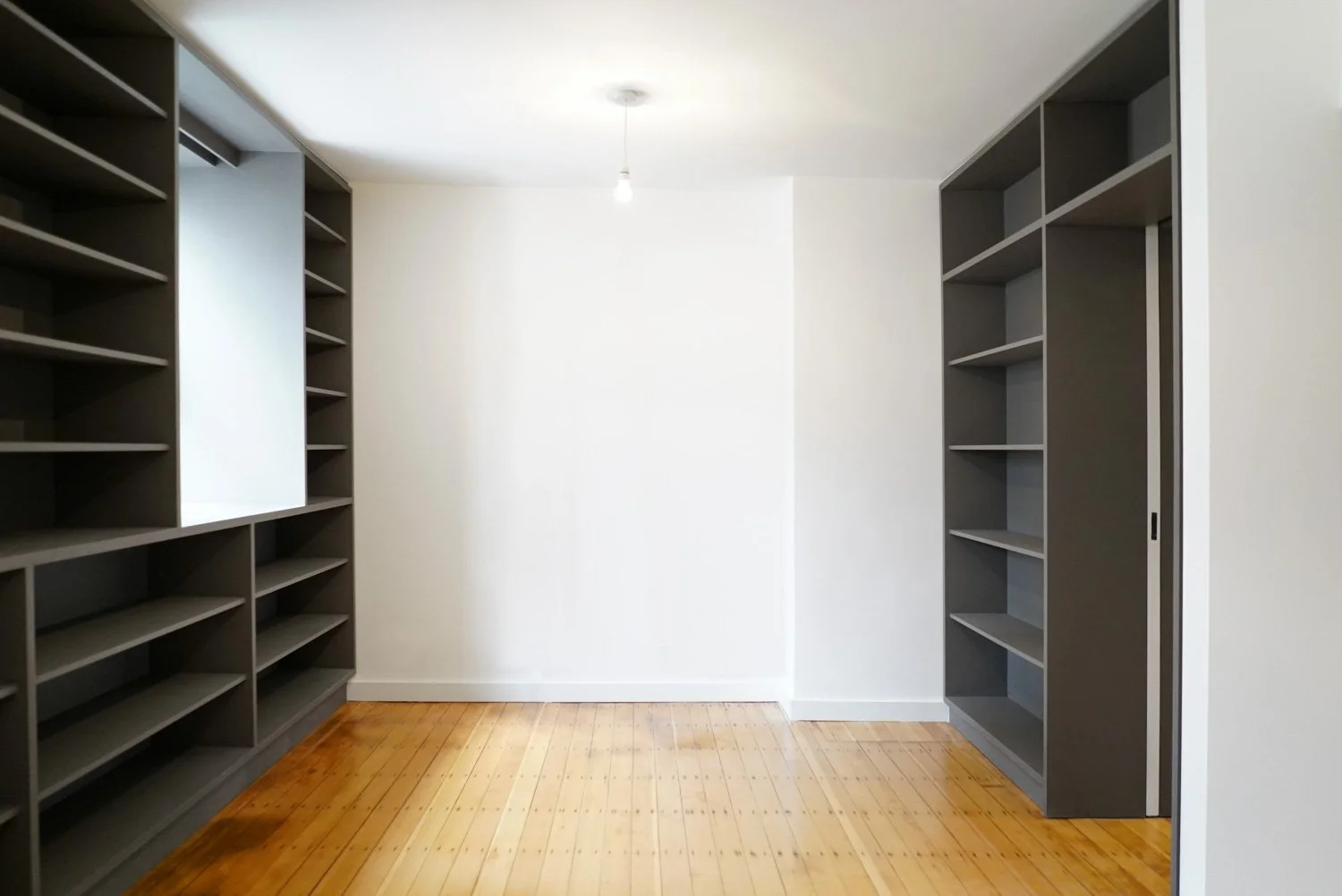 A two-storey home designed for a reader above a store in central London underwent a refurbishment, utilising dark valchromat storage to re-order the plan and create ample storage for over 4000 books, magazines, programmes and music. The resulting bookcases become an organising feature, lining every wall, and creating deep reveals that protect the volumes from sun exposure. Minimal architectural intervention was sought; floors are repaired, sanded and sealed throughout, living spaces are given new connections to one another, bedrooms uplifted, and a modest new kitchen and bathroom break away from the natural palette seen elsewhere, using bright glazed tiles to add colour and contrast. The feature bathroom tiling takes inspiration from Matthew Newman’s zip paintings